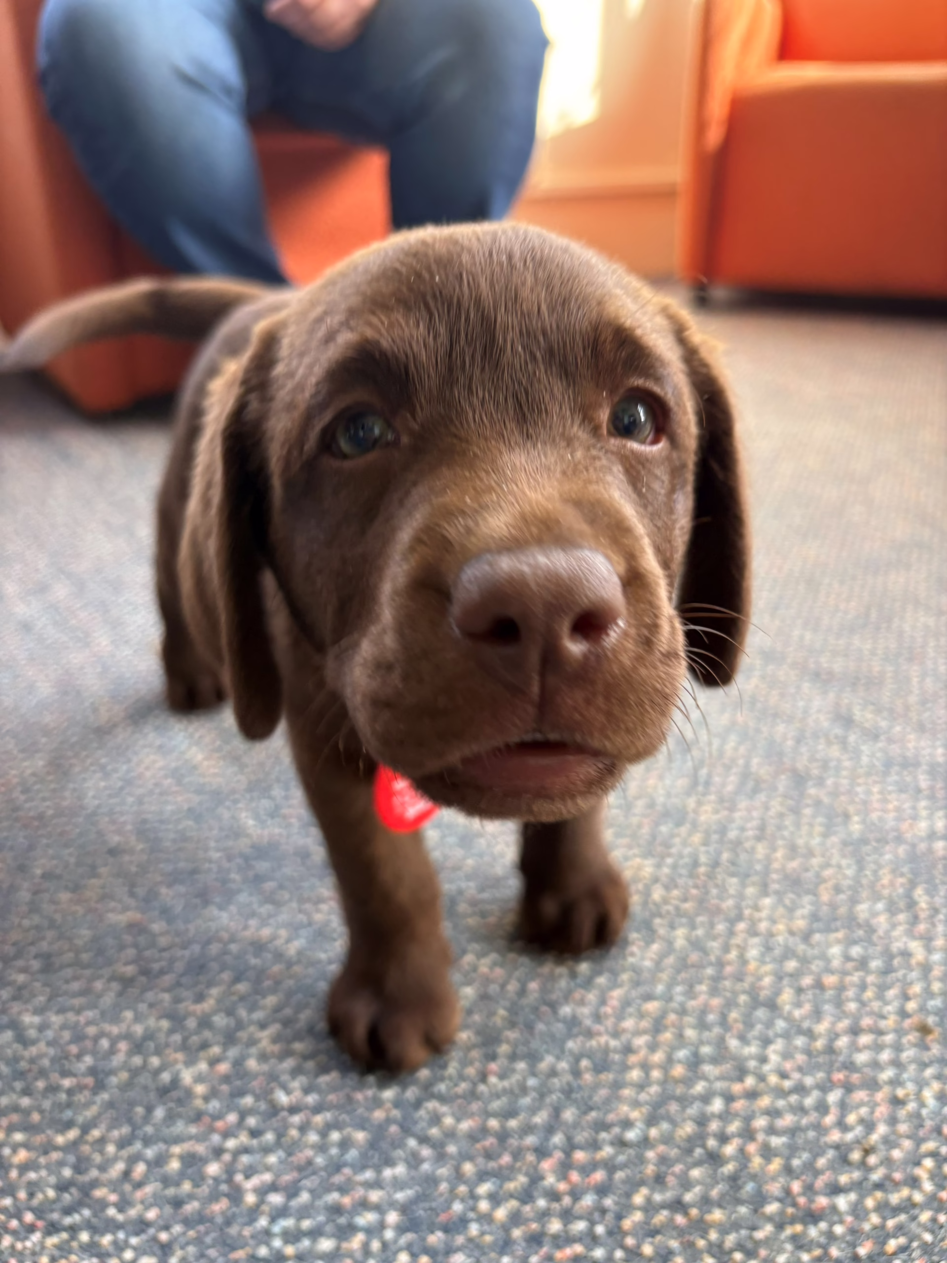 Coco arrived into the world with boundless enthusiasm and zero concept of personal space. Her raiser describes her as “chonky” and “roly-poly” – qualities she wears with considerable pride. She can already sit (properly, bottom on the floor and everything), she’s working on “down,” and she has mastered the art of letting her raiser know when she needs to go outside. She is sleeping through the night, and everyone – Coco included – is very pleased about this.